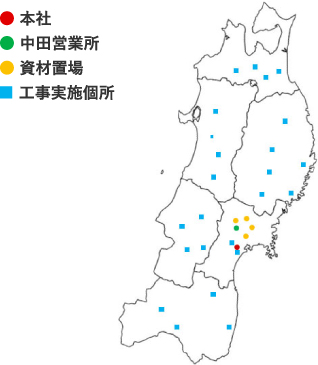 の協力会社として、東北各地の電気通信土木工事を営み、昭和60年2月4日に中田建設工業(株)に社名変更し、創業以来半世紀以上にわたって、官庁や民間企業より発注された通信・道路・ガス
